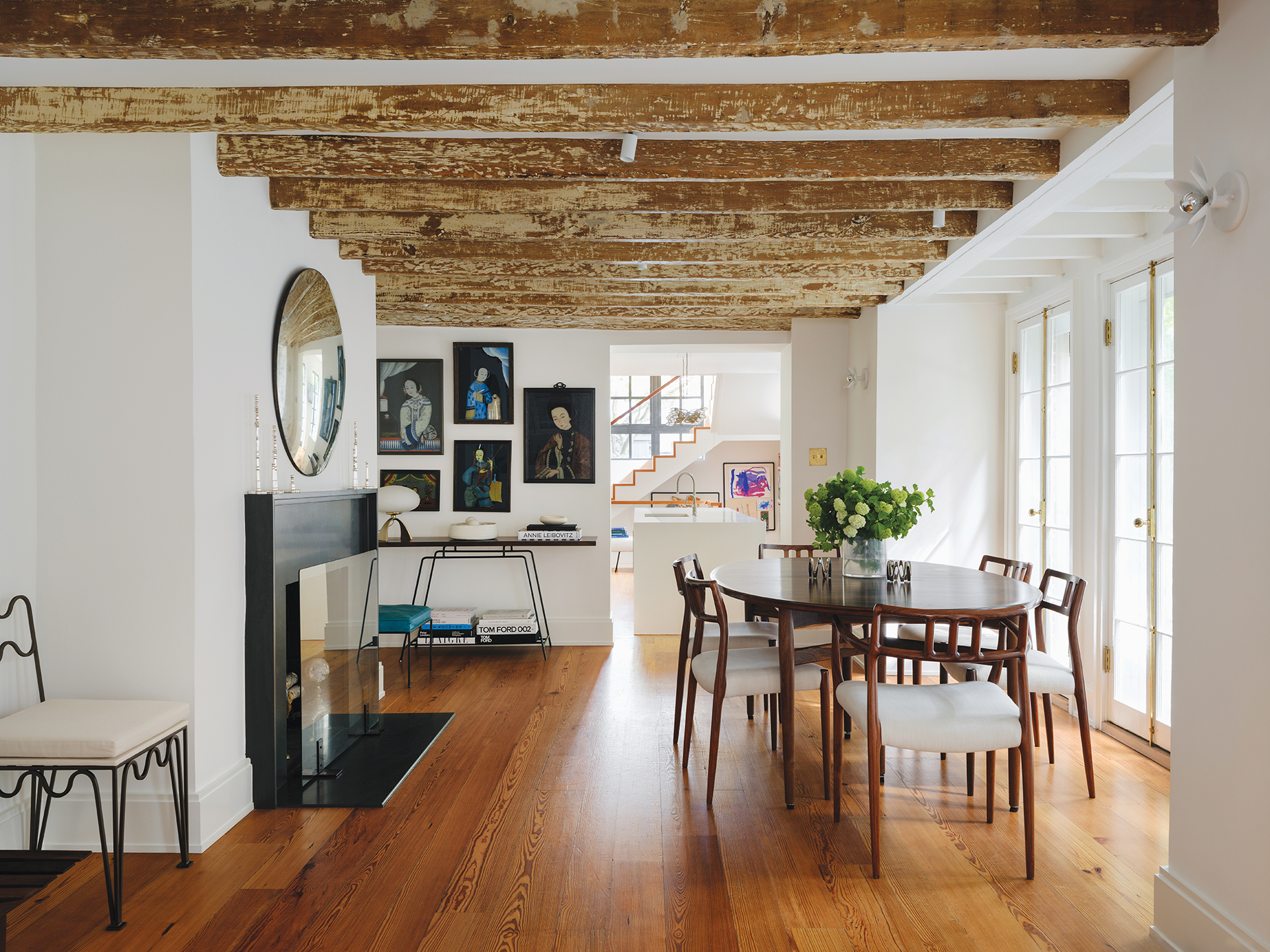 To maintain the home’s historic integrity, Kassum and Zapatka used reclaimed pine for the floors, perfectly matching them to the century-old boards in the original structure. The walls were given a rustic plaster finish in Benjamin Moore’s Simply White, adding to the timeless yet minimalist vibe of the house.