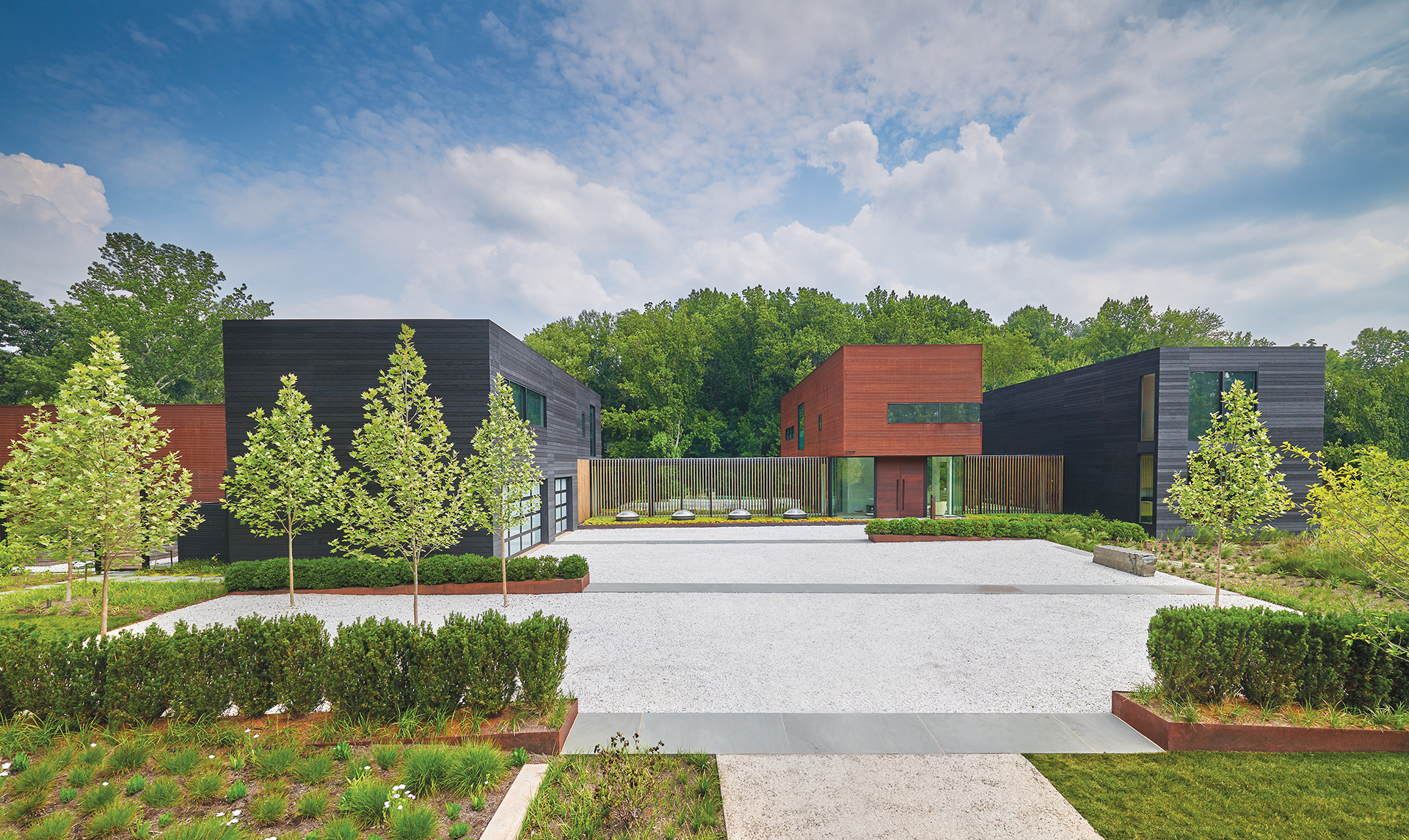 Interior designer Therese Baron Gurney and landscape architects Kevin Campion and Steve Makrinos were instrumental in merging the indoors with the outdoors. The landscape design focuses on biodiversity, with the addition of numerous grasses, pollinator plants, and retaining walls made of Corten steel.