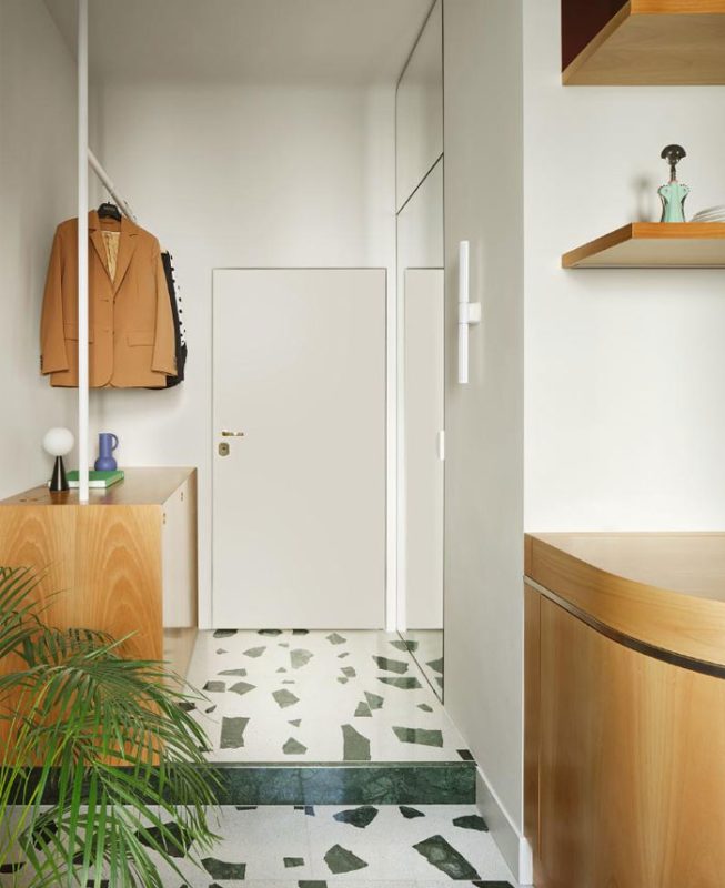 The full-height mirror, which is half the door to the bathroom and half the door of a cabinet, doubles the size of the entrance and frees the screen wall from its constraints. But it is also the very useful mirror for the last look at your outfit before leaving home.