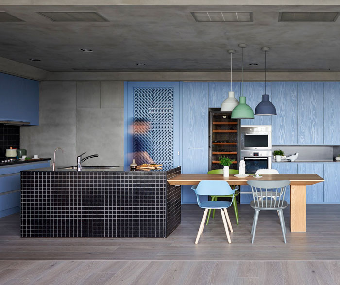 Here we have a magnificent example of how to create a hidden kitchen presence. Sliding panels in a trendy deep blue color enclose or open a kitchen zone composition by Fala Atelier from the Portuguese architecture studio. It is cool how they had transformed an old house in Porto into a contemporary and trendy home design.